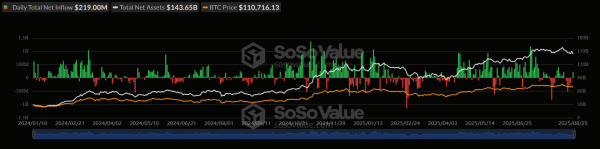 У сегменті спотових біткоін-ETF чистий приплив капіталу склав $219 млн. Позитивною динамікою відзначилися шість продуктів, а саме: