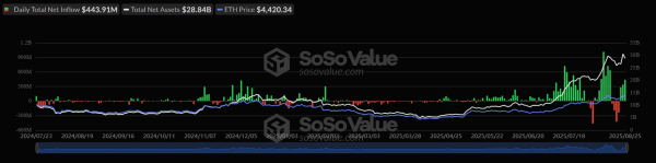 У секторі спотових Ethereum-ETF приплив становив $443,91 млн за добу. Це переважно новий капітал у фонді ETHA від BlackRock – $314,89 млн. Крім нього, позитивною динамікою також відзначилися: