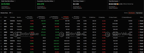 28 серпня 2025 року спотові біткоін-ETF зафіксували загальний приплив у $178,9 млн. Позитивна динаміка тримається вже чотири торгові дні поспіль. Найбільший обсяг капіталу залучив ARKB — $79,81 млн.