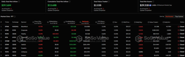 У сегменті спотових Ethereum-ETF притоки продовжуються шосту торгову сесію поспіль. За 28 серпня загальна сума склала $38,16 млн. Найбільший приплив показав ETHA – $67,62 млн, за ним – ETH з $6,27 млн.