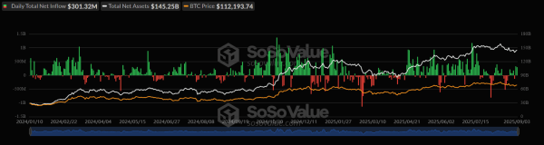 Торгову сесію 3 вересня 2025 року спотові біткоін- та Ethereum-ETF закрили з різною динамікою. У першому секторі зафіксовано приплив капіталу $301,32 млн, у другому — відтік, $38,24 млн, за даними SoSoValue.