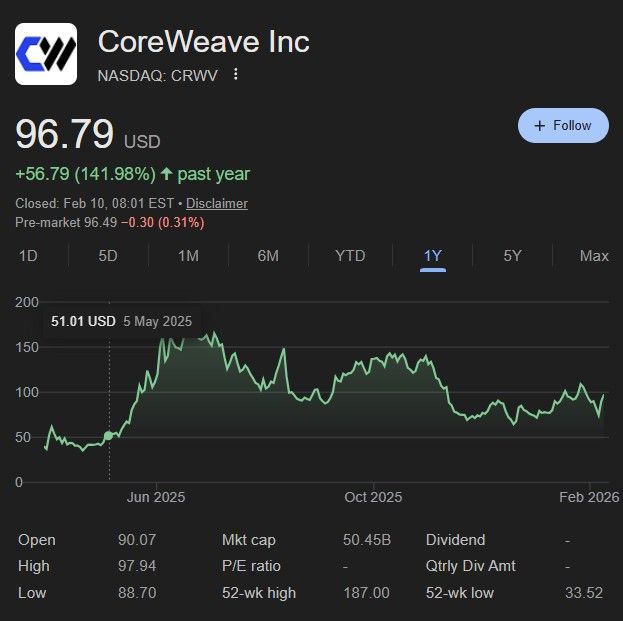 На момент публікації ціна акцій CoreWeave становила 96,79 долара, що на 141,92% більше, ніж за останні дванадцять місяців.