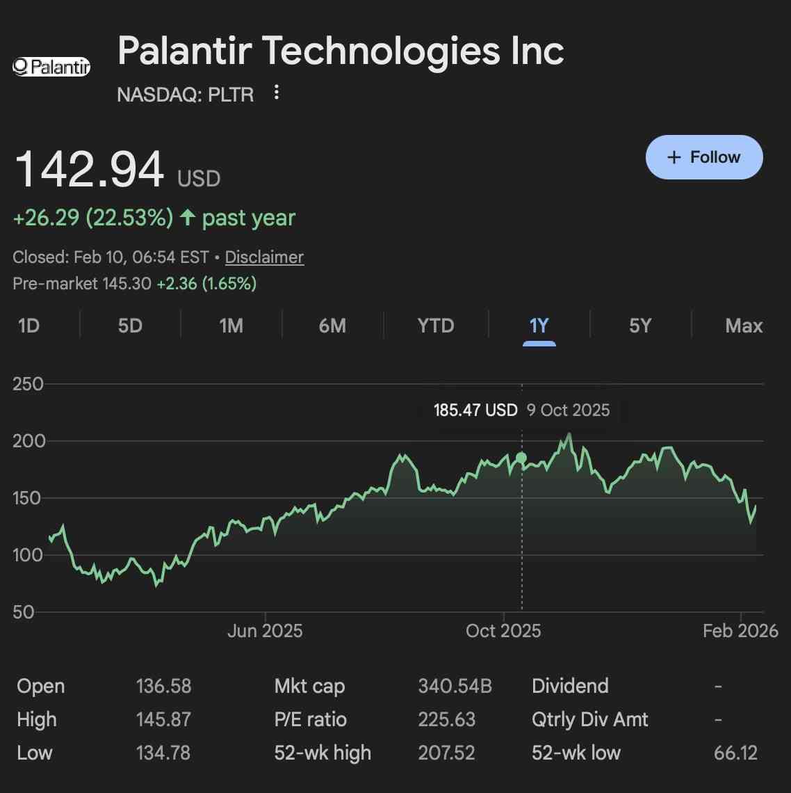 На момент публікації акції Palantir торгувалися за ціною $142,94, що на 22,53% більше, ніж на річному графіку.