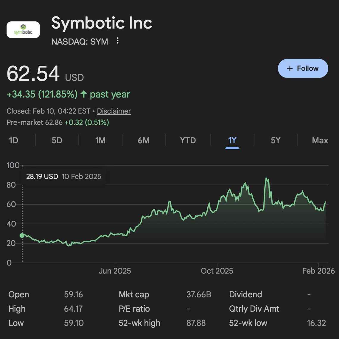 На момент написання статті акції Symbotic торгувалися за ціною $62,54, що на 121,85% більше, ніж минулого року.
