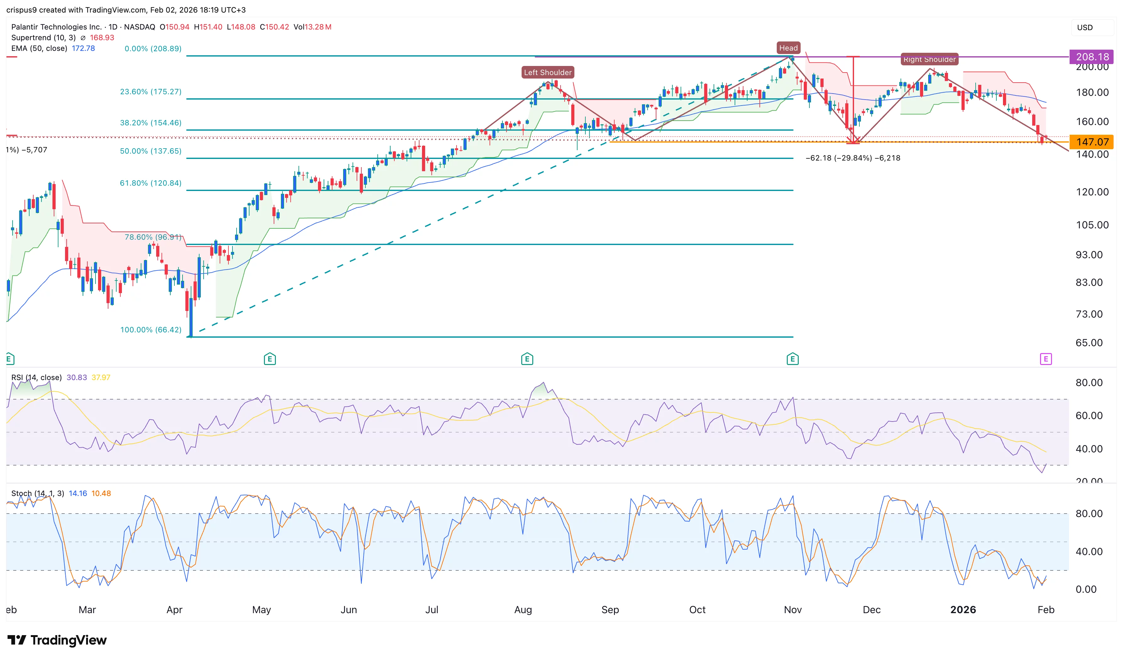 Його голова знаходиться на історичному максимумі в $208, тоді як лінія шиї – на рівні $147, де вона торгувалася до публікації звітності. Відстань між головою та лінією шиї становить близько 30%.
