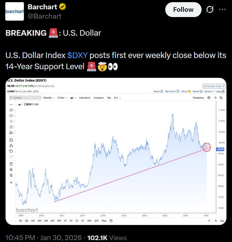 Макроінвестори давно стверджують, що слабший долар не лише допустимий, а й бажаний за нинішніх умов. Рауль Паль, засновник Real Vision, раніше зазначав, що «кожен потребує та хоче слабшого долара для обслуговування своїх доларових боргів», особливо в умовах глобальної системи, яка сильно залежить від зобов'язань, деномінованих у доларах.