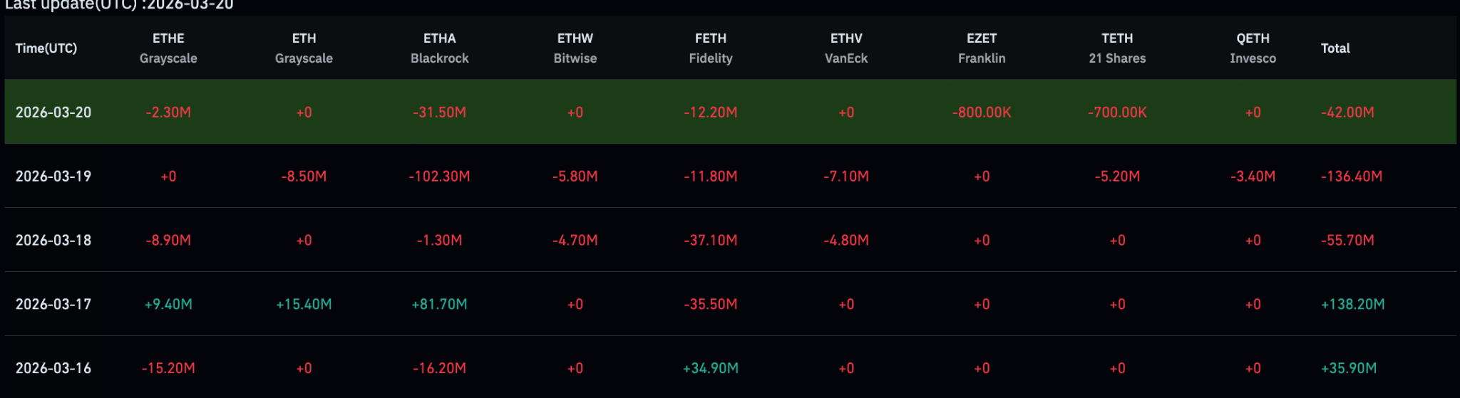 Однак у другій половині тижня настрої різко змінилися. 18 березня інвестиційний гігант зафіксував відтік приблизно 33,9 мільйона доларів, а 19 березня – 38,3 мільйона доларів.