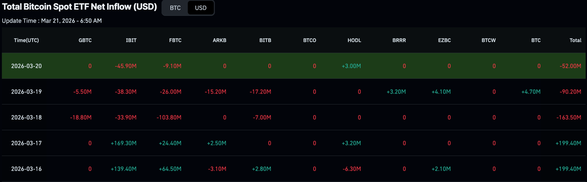 Тиск продавців посилився 20 березня, і з фонду було виведено додаткові 45,9 мільйона доларів. Незважаючи на цю триденну серію відтоку коштів, попередній приплив коштів був достатньо сильним, щоб забезпечити BlackRock чистий тижневий прибуток у розмірі близько 190,6 мільйона доларів у біткойнах.