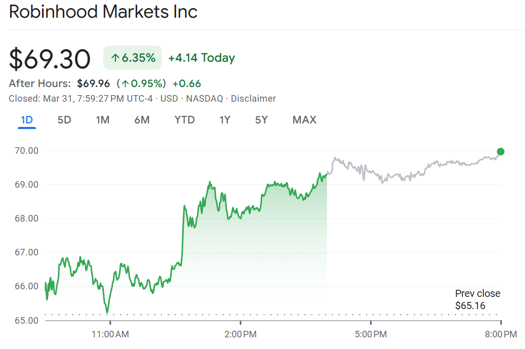 Акції HOOD відреагували на імпульс, зросши на 6,35% до $69,30 31 березня, а після закриття торгів підскочили до $69,96.