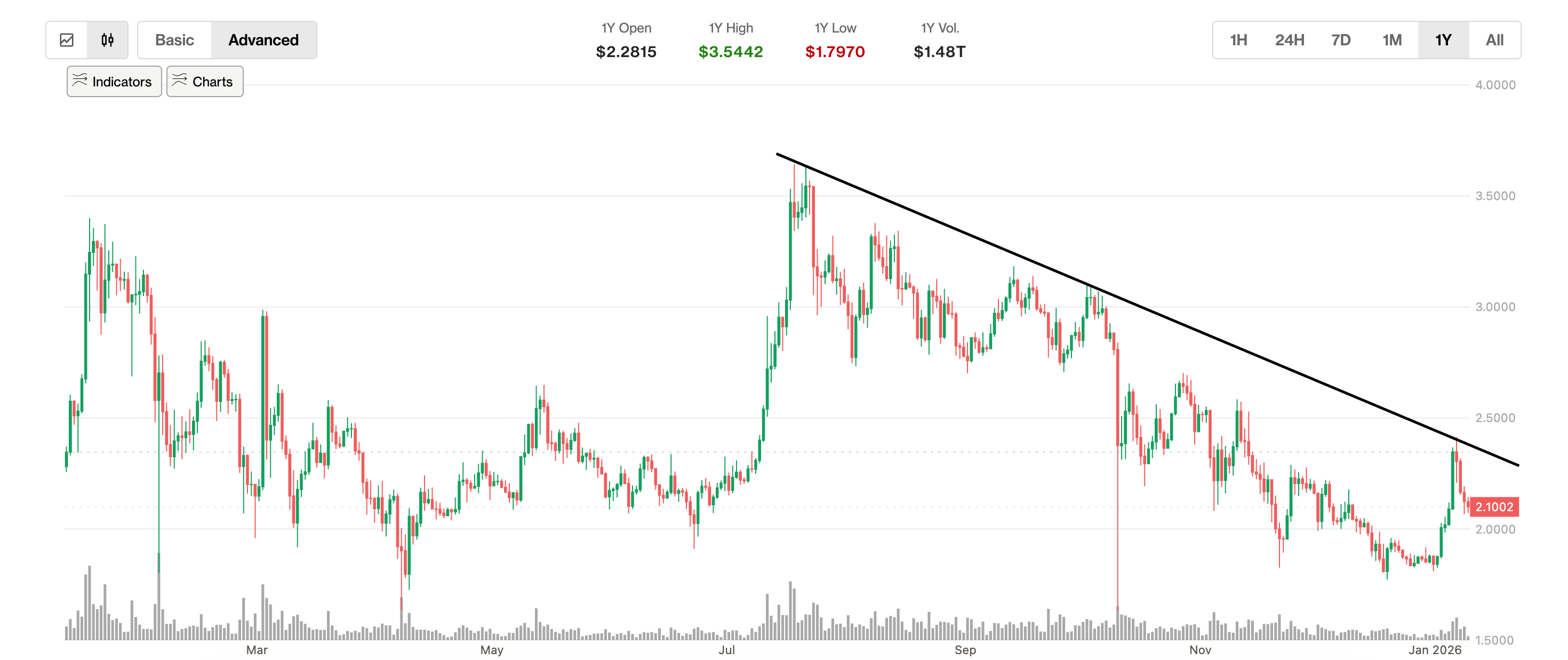 - Графік показує щоденні коливання ціни XRP у форматі свічок.
