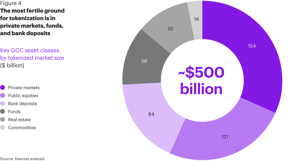 Kearney, глобальна консалтингова фірма з управління, у своєму нещодавньому звіті підтверджує, що прогнозоване зростання використання токенізації в країнах GCC (Ради співробітництва арабських держав Перської затоки) становить близько 500 мільярдів доларів активів. Плідними секторами для токенізації є приватні ринки, фонди та банківські депозити, тоді як основними каталізаторами є фінансові установи, компанії з управління активами та суверенні фонди.