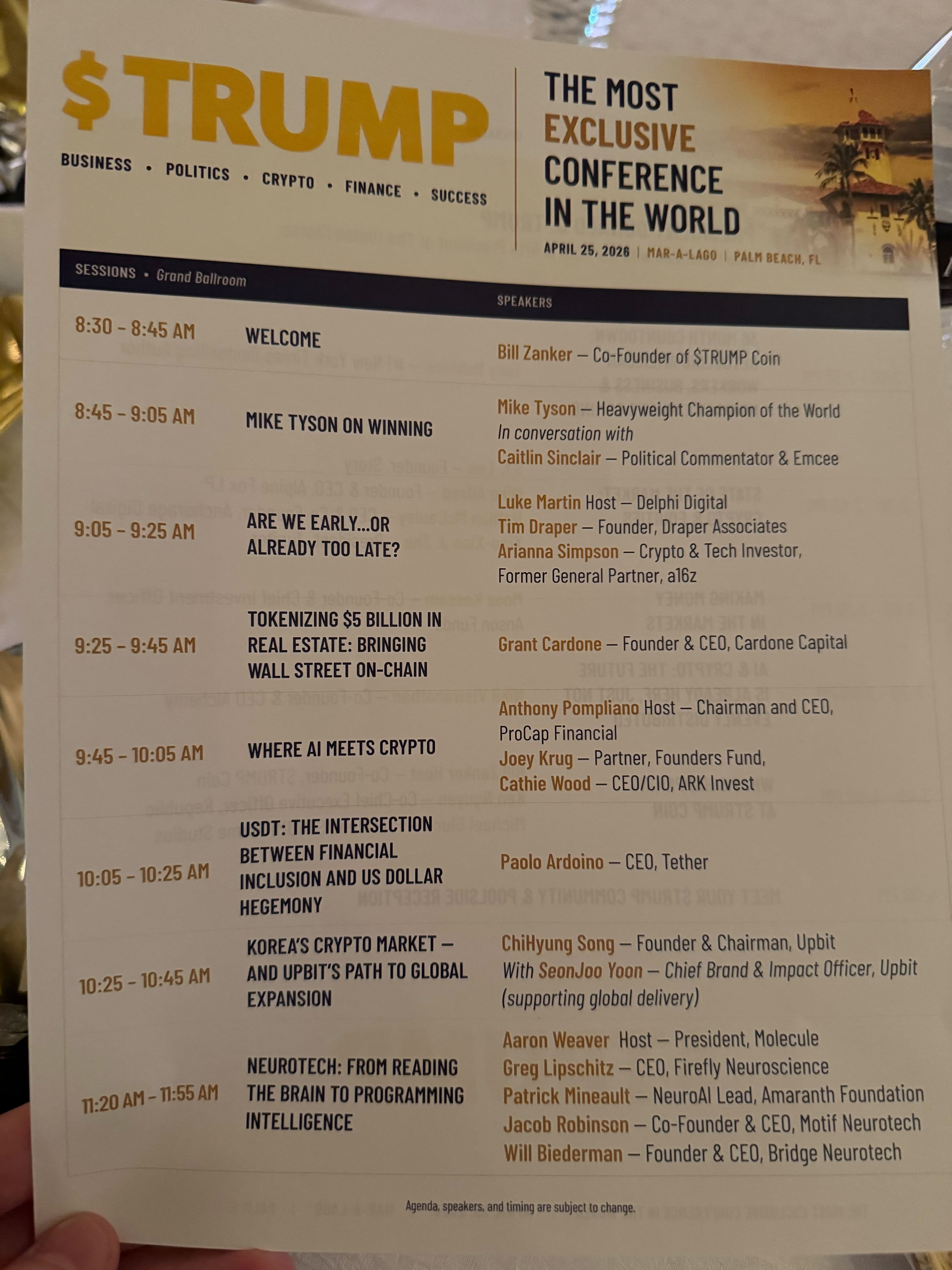 Захід, який рекламують як «найексклюзивнішу конференцію у світі», розпочався з виступу Білла Занкера, співзасновника мемкоїну $TRUMP , а потім виступив легендарний боксер Майк Тайсон.