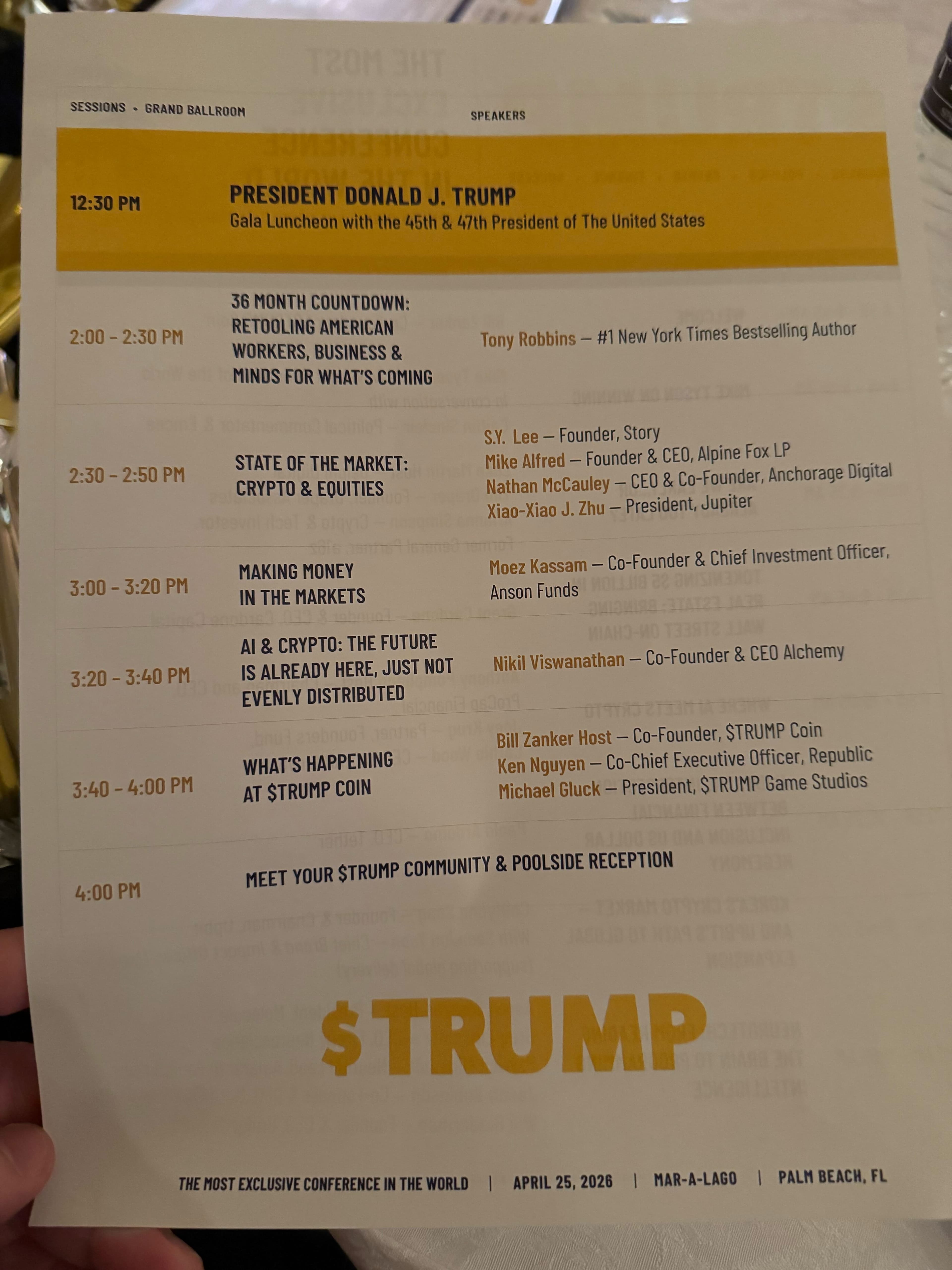 Цей захід рекламується як важлива зустріч, присвячена криптовалюті та фінансам, пов'язана з ширшими зусиллями Трампа щодо підтримки індустрії цифрових активів після його повернення до Білого дому в січні 2025 року. На веб-сайті конференції Трамп вказано основним доповідачем, і зазначається, що участь у ній обмежена 297 найкращими власниками токена $TRUMP , мем-коїна, запущеного від його імені.