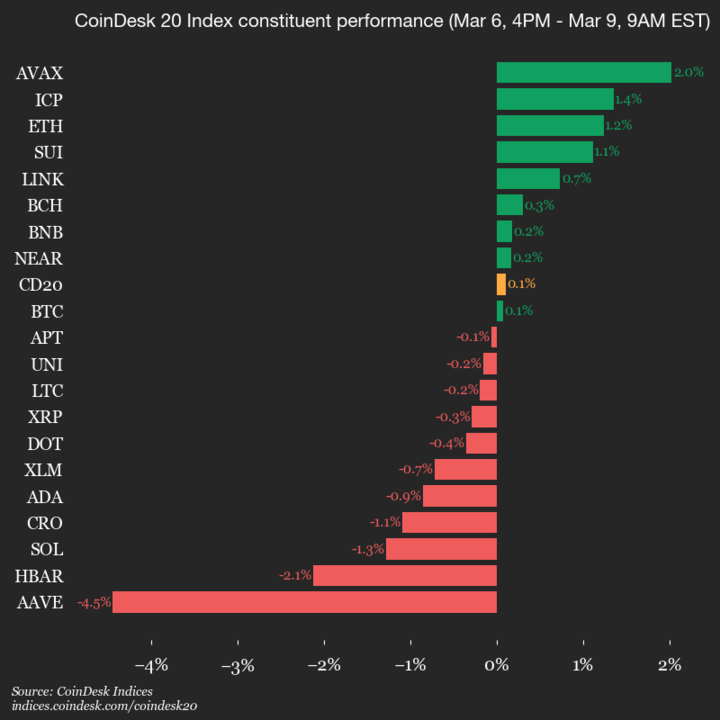 Лідери: AVAX (+2,0%) та ICP (+1,4%).