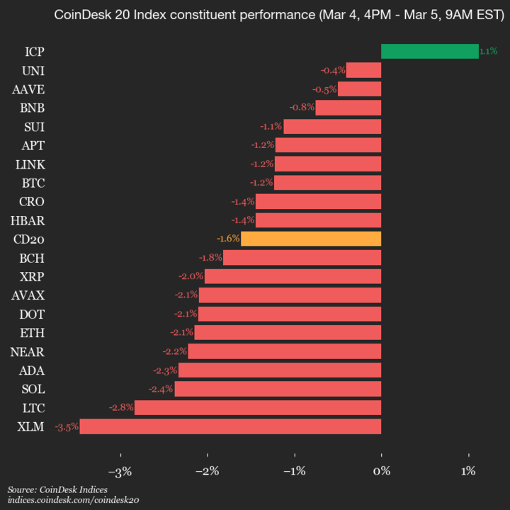 Оновлення показників CoinDesk 20: Stellar (XLM) падає на 3,5%, оскільки майже всі активи падають