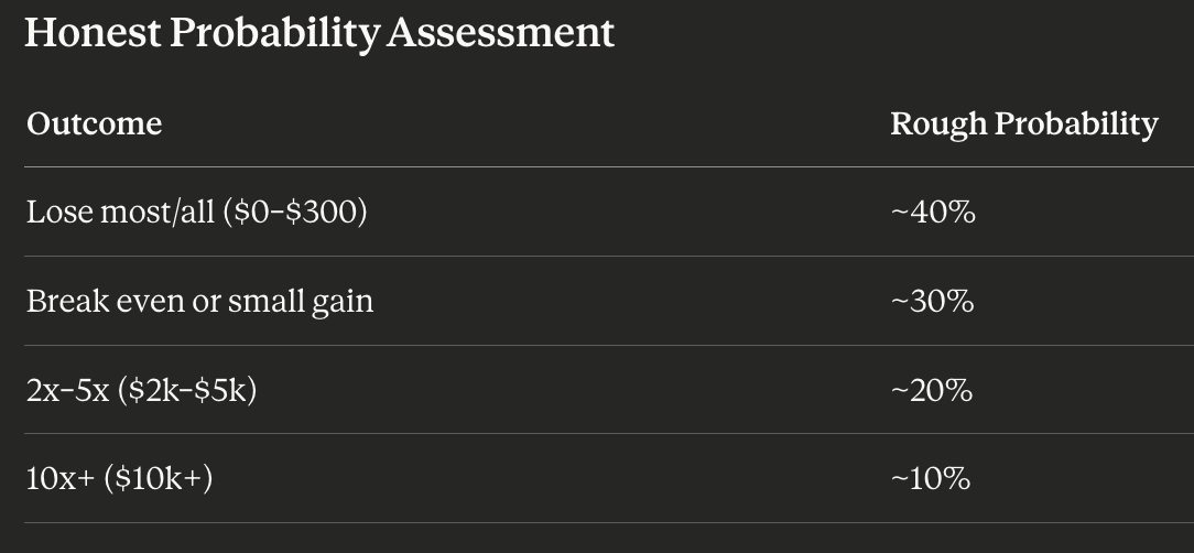 Незважаючи на структурований підхід, Клод ШІ визначає 40% ймовірність значних збитків, 30% ймовірність беззбитковості або досягнення скромних прибутків та лише 10% ймовірність досягнення цільової позначки в 10 000 доларів.