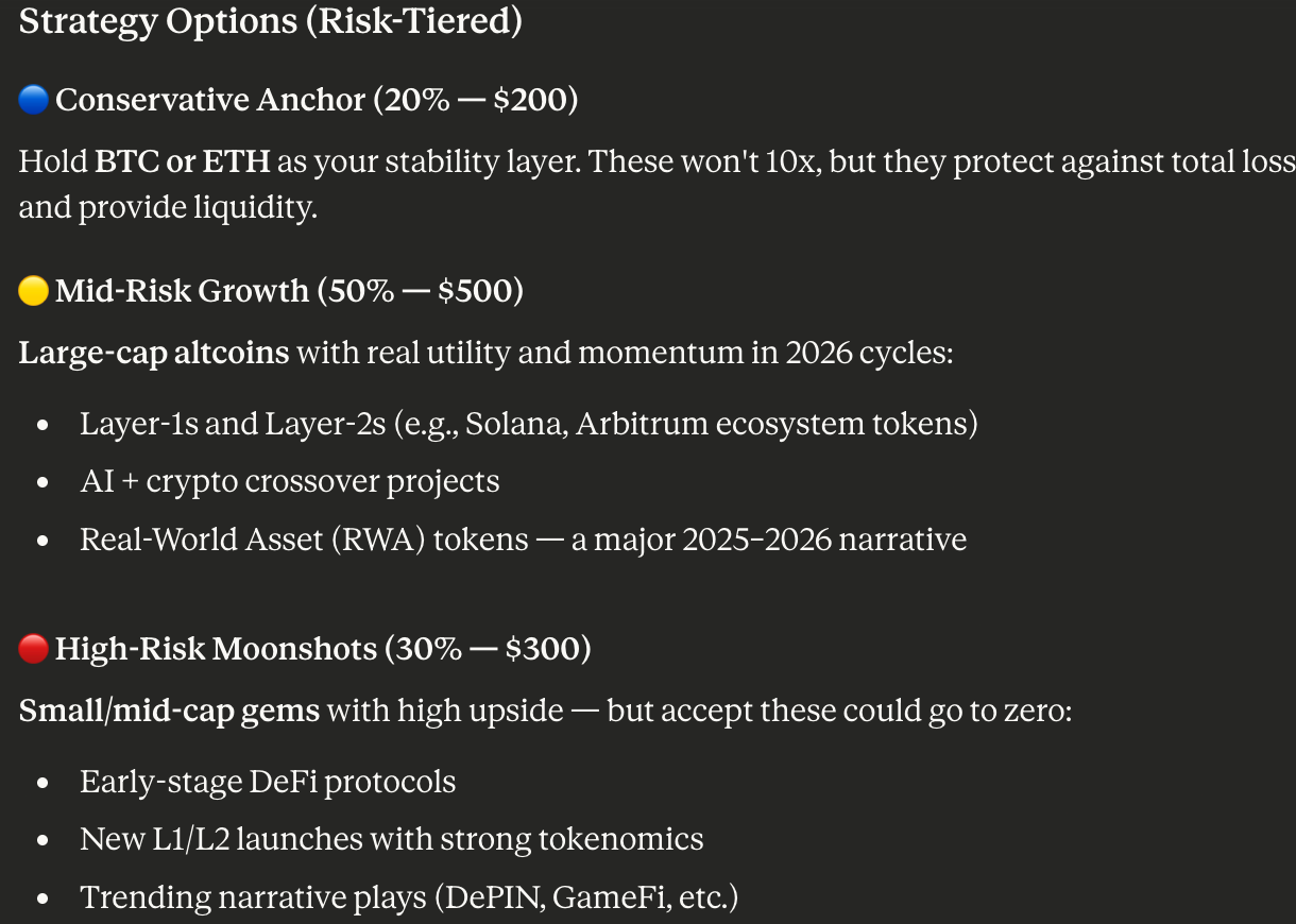Стратегія розподілу 1000 доларів США в криптовалюті. Джерело: Клод ШІ