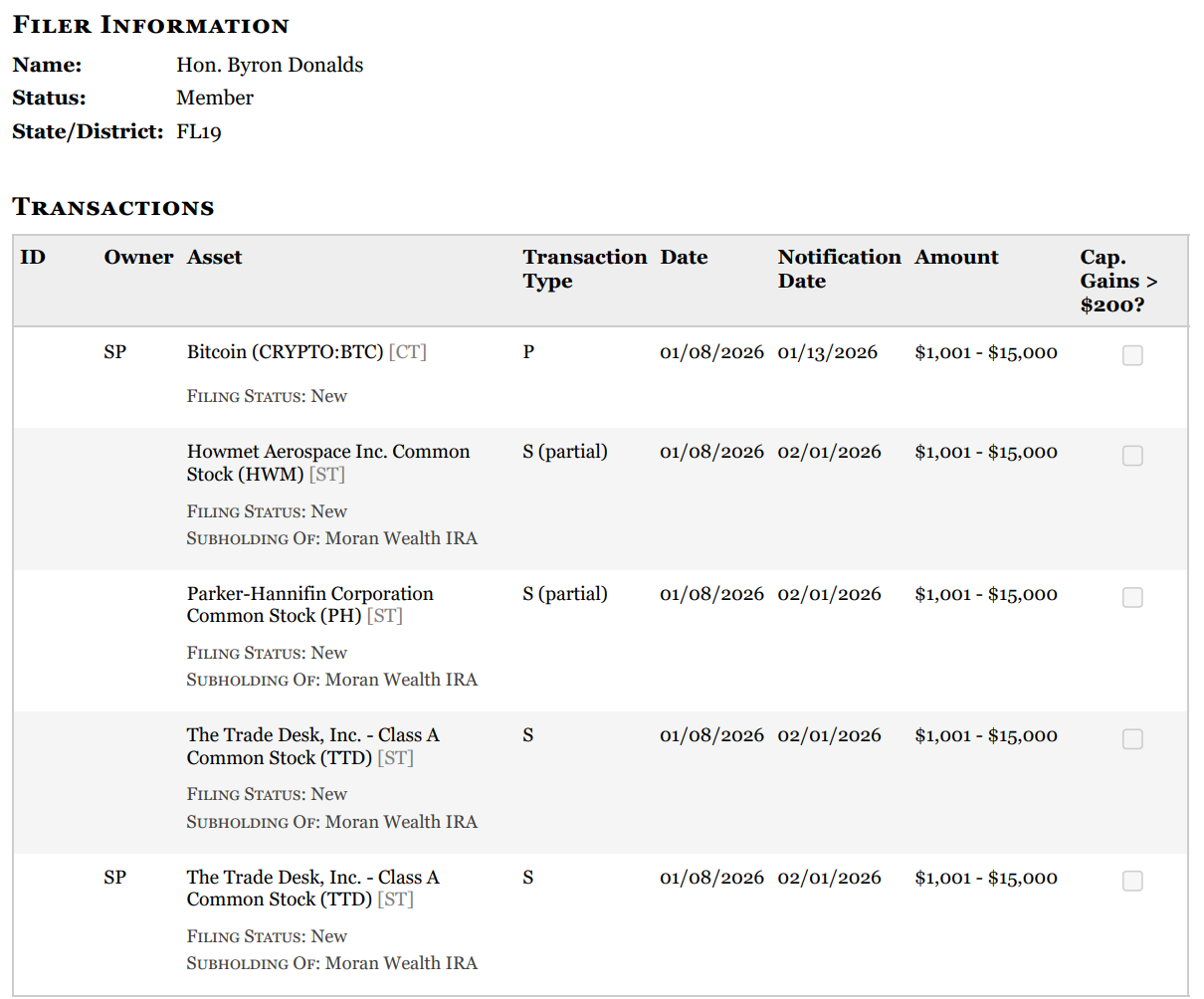 Член Палати представників США Байрон Дональдс опублікував нове фінансове розкриття інформації, яке демонструє купівлю криптовалюти в той час, коли ринки цифрових активів перебувають під тиском.