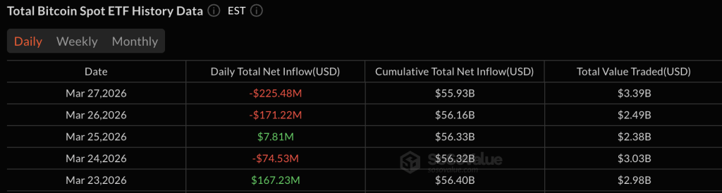 З ETF біткойна зафіксовано різкий чистий відтік у розмірі 225,48 мільйона доларів, що стало одним з найбільших одноденних відтоків за тиждень. Продажі були концентрованими, але рішучими. Переважну більшість склала IBIT Blackrock, втративши лише 201,53 мільйона доларів. BITB Bitwise слідував за ним з відтоком 18,60 мільйона доларів, тоді як ARKB Ark & 21Shares зафіксував менший відтік у розмірі 5,35 мільйона доларів.