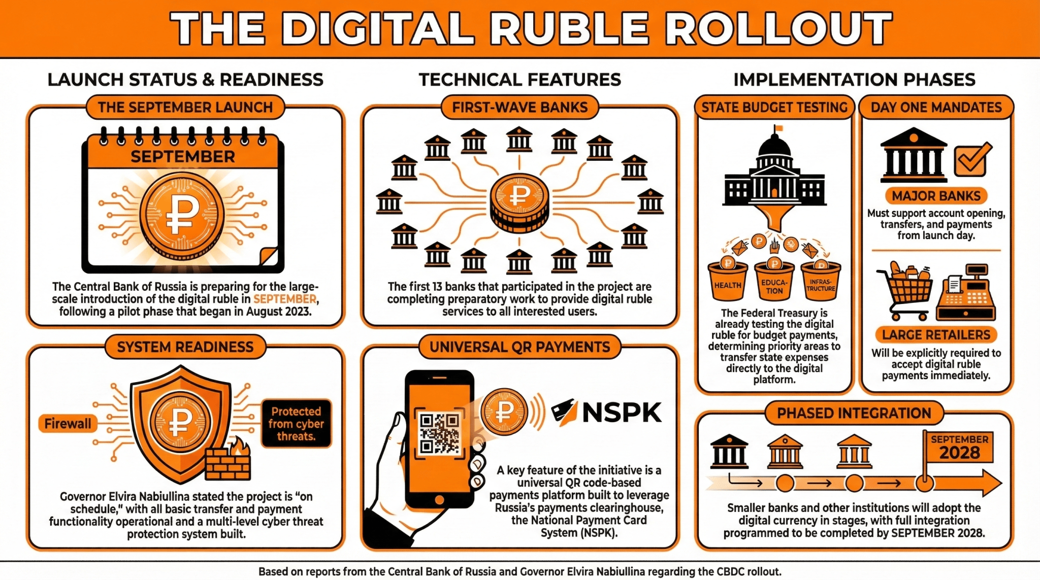 Великі банки повинні підтримувати операції з цифровим рублем з дня запуску, тоді як менші банки розпочнуть інтеграцію поступово, досягнувши повної інтеграції до вересня 2028 року .