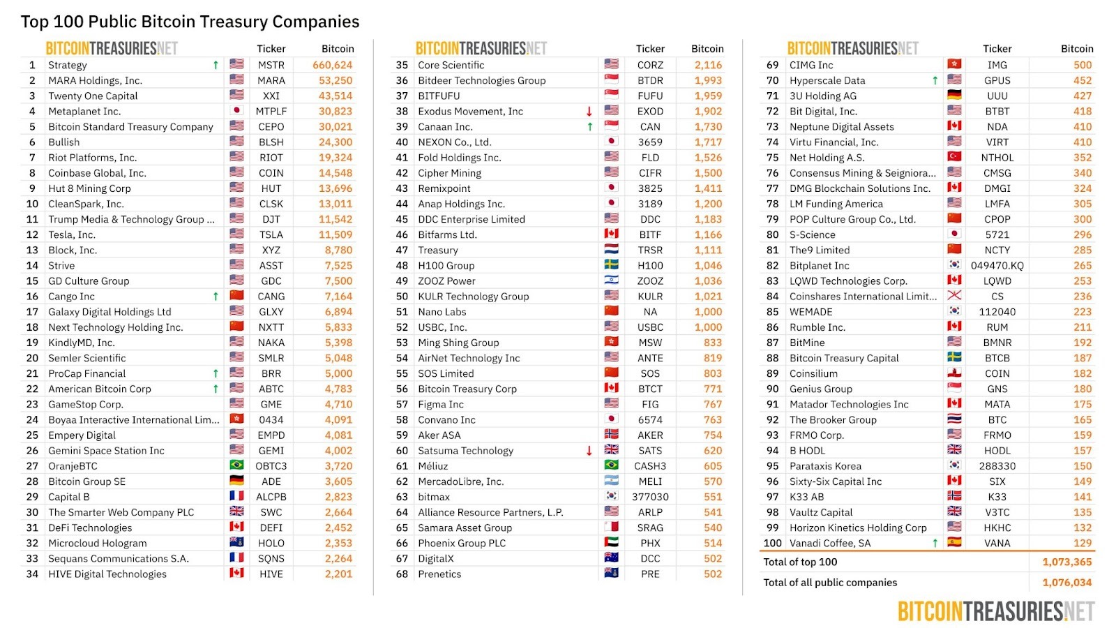 Найбільші публічні біткойн-казначейські компанії. Джерело: BitcoinTreasuries.NET