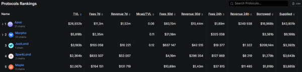 Aave впевнено утримує першість серед лендингових платформ. Сукупна заблокована вартість в протоколі складає понад $26,9 млрд.