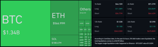 Різке зниження цін викликало серію ліквідацій. За інформацією CoinGlass, щоденний обсяг примусових закриттів досяг $2,59 млрд. Основний тягар ліг на довгі позиції — $2,11 млрд.
