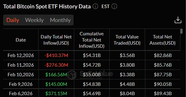 12 лютого чистий відтік коштів з американських спотових біткоїн-ETF становив $410,37 млн.
