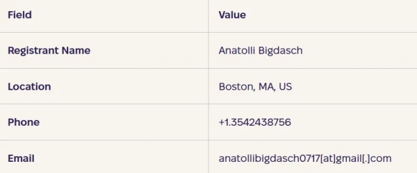 Адреси фальшивих вебсайтів зареєстровані на ім’я Анатолія Бигдаша з Бостона, США. Експерти ставлять під сумнів реальність цієї особи.