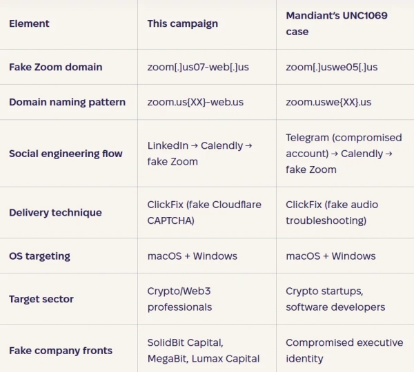 Дослідники помітили збіг тактики з методами угрупування UNC1069, яке атакує криптопроєкти з 2018 року. Аналітики Mandiant раніше пов’язували його з Північною Кореєю. Злочинці використовують ідентичні структури шкідливих посилань і подібні сценарії обману через фальшиві відеодзвінки.