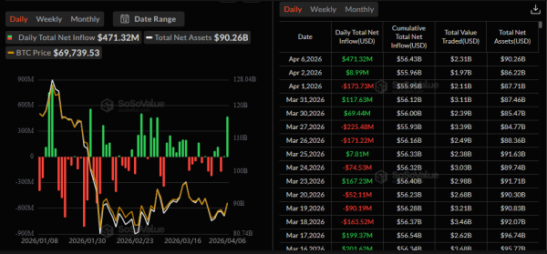 За торгову сесію 6 квітня американські спотові біржові фонди, що базуються на першій криптовалюті, залучили $471 млн. Це є найбільшим припливом з 25 лютого ($507 млн).