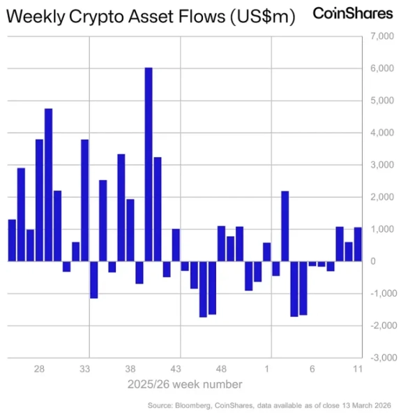 За період з 9 по 13 березня надходження капіталу в криптоінвестиційні інструменти досягло $1,06 млрд. Позитивна тенденція спостерігається третій тиждень безперервно, як зазначили аналітики CoinShares.