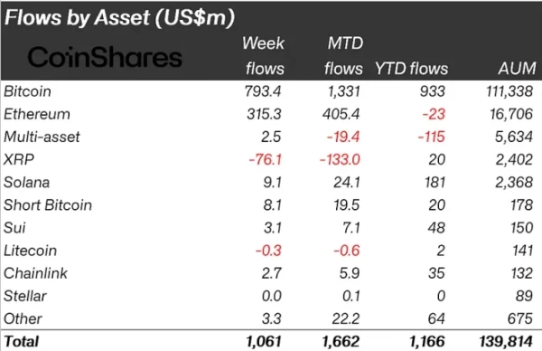 Інструменти на основі першої криптовалюти отримали $793 млн. За три тижні показник досяг $2,2 млрд, що частково компенсувало попередній п’ятитижневий відплив у $3 млрд. Продукти, що дають змогу відкривати короткі позиції по біткоїну, залучили $8,1 млн.
