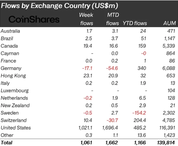 Основну частину притоку (96%) забезпечили інвестори з території США. На Гонконг, Канаду та Швейцарію припало $23,1 млн, $19,4 млн і $10,4 млн відповідно.
