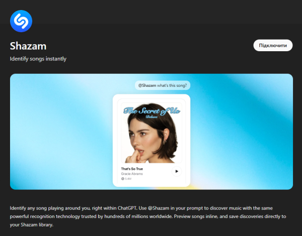 Декілька місяців тому Apple впровадила в нейромережу інтеграцію з Apple Music, надавши користувачам можливість створювати добірки музики. Тепер сервіс Shazam, що є власністю цієї корпорації, також став частиною екосистеми OpenAI.