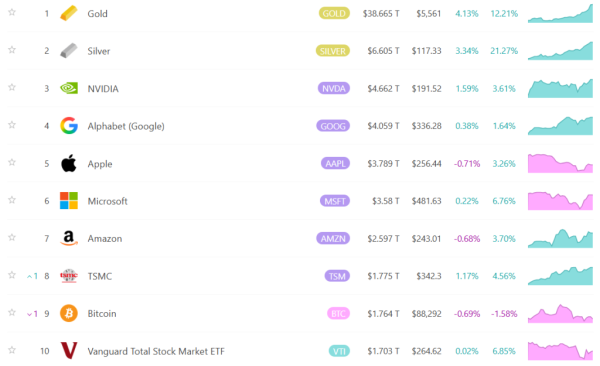 Срібло також показало зростання, збільшившись у ціні приблизно на 22% за минулий тиждень. Його капіталізація склала $6,6 трлн.