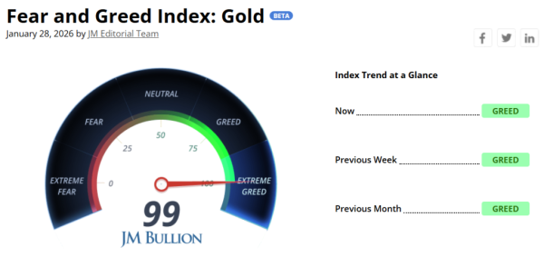 Відповідний показник для золота від JM Bullion досяг 99 пунктів, що свідчить про «надзвичайну жадібність».