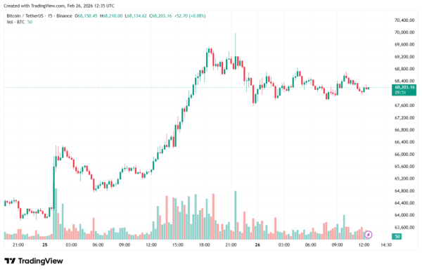 На час написання біткоїн торгується приблизно на рівні $68 203. Це трохи вище 200-тижневої експоненціальної ковзної середньої (EMA) на рівні ~$68 330.