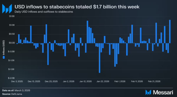 Сумарний приплив капіталу у стейблкоїни злетів на 414,5% і за сім днів досяг $1,7 млрд. Про це повідомляється у звіті аналітиків Messari.