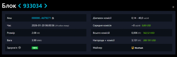 Двадцятого січня індивідуальний майнер отримав блок #933 034 у мережі біткоїна. Його заохочення склало 3,131 BTC ($289 191).