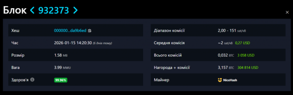 П’ятнадцятого січня ще один майнер-одинак успішно додав у мережу блок #932 373. Його загальний прибуток становив $304 814.