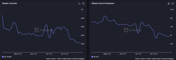 З початком 2025 року обсяг опублікованого коду в криптопроєктах знизився на 75% — з 850 000 до 210 000. Кількість активних програмістів зменшилася на 56%, до 4600, згідно з даними Artemis.