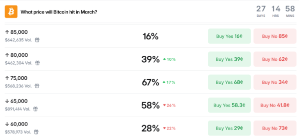 Учасники платформи передбачень Polymarket змінили свої очікування на більш оптимістичні. Вірогідність досягнення позначки $80 000 у березні збільшилася з 20% до 39% протягом доби.