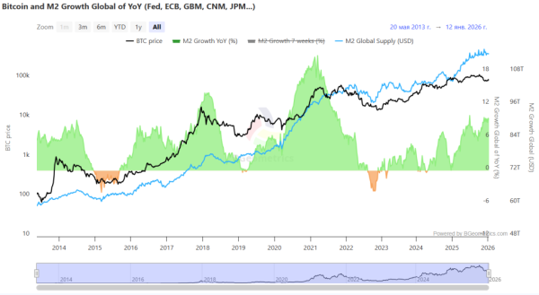 Поточні макроекономічні обставини сприяють зростанню. Глобальна ліквідність (агрегат грошової маси M2) зростає, а ФРС США завершує стратегію кількісного стиснення.