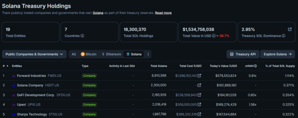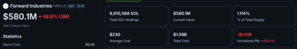 Найбільший власник, Forward Industries, акумулював 6,9 млн SOL за середньою вартістю $230. “Умовний” збиток компанії перевищив $1 млрд.