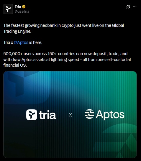 Tria оголосила про інтеграцію Aptos у свою глобальну торгову систему – платформу, яка об’єднує понад 500 000 користувачів у понад 150 країнах. Відтепер ці користувачі можуть вносити депозити, торгувати та виводити власні активи з мережі $APT безпосередньо з того самого рахунку самостійного зберігання, який вони вже використовують для управління своїм портфелем, отримання прибутку та оплати карткою Visa у понад 150 мільйонах торгових точок.