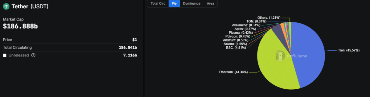 Згідно з даними DeFiLlama, щось подібне відбувається зараз. Пропозиція $USDT розподілена майже порівну між Ethereum (44,34%) та Tron (45,57%), залишаючи дуже невеликий розрив між ними.