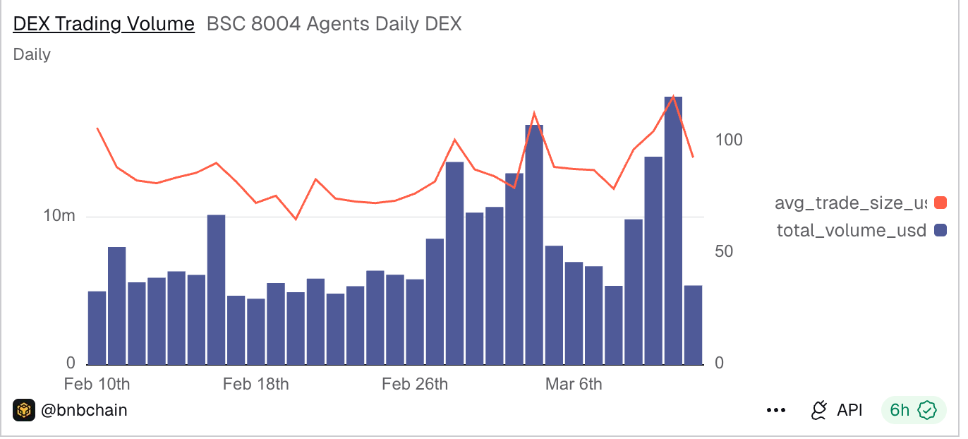 Обсяг торгів, здійснених агентами на децентралізованих біржах на $BNB Chain з лютого, також досяг денного максимуму вчора, 11 березня, понад 18,1 мільйона доларів.