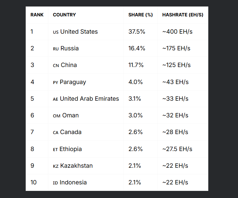 Незважаючи на заборону, Китай все ще вважається третьою за величиною країною з майнінгу біткойнів (BTC). У січні 2026 року на нього припадало 11,7% світового хешрейту, згідно з даними Compass Mining.