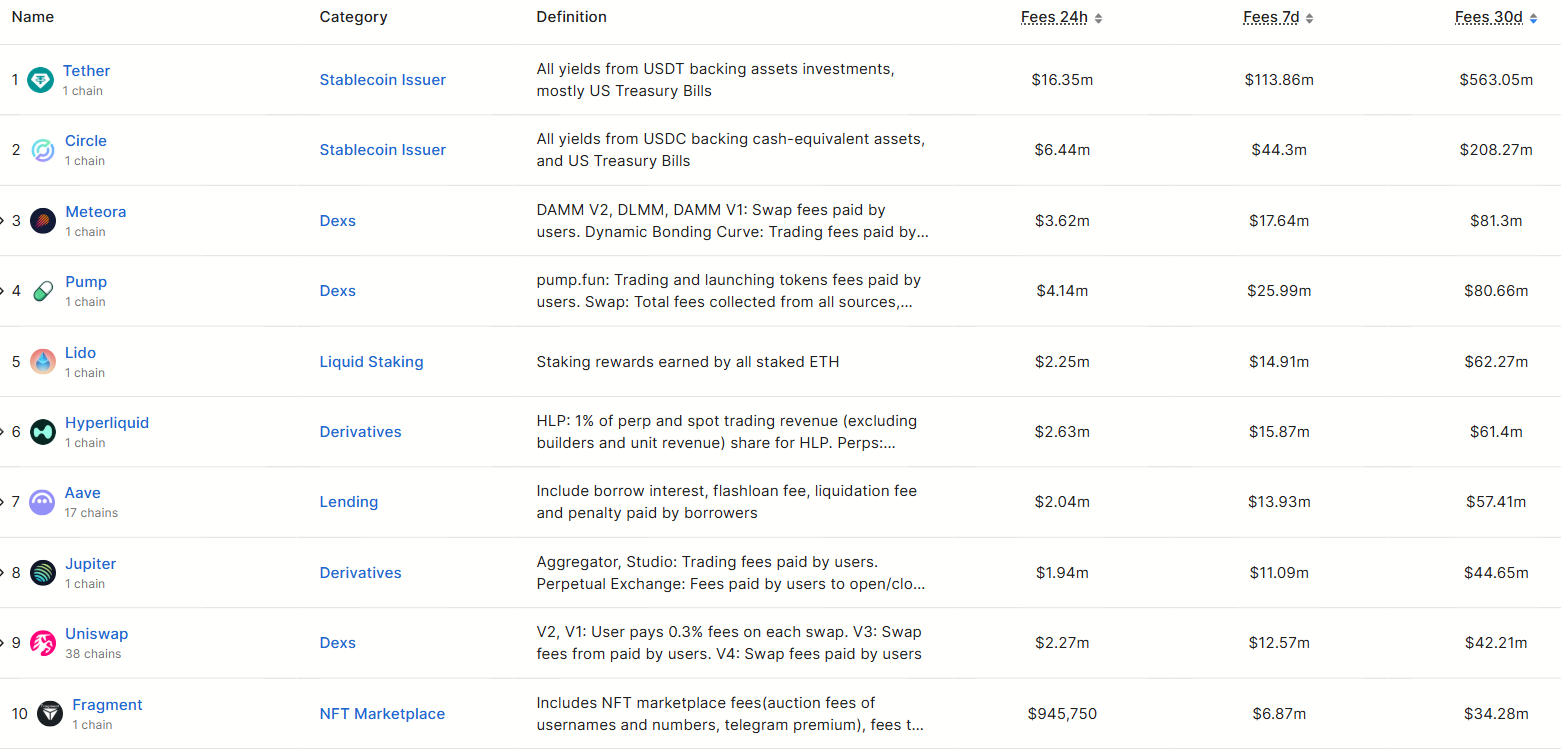Дані, зібрані DeFiLlama, показують, що DeFi-протоколи зараз домінують у рейтингах криптопродуктів з найвищим рівнем прибутку. 17 найбільшими джерелами комісій за останні 30 днів були додатки або протоколи, а не блокчейни базового рівня.